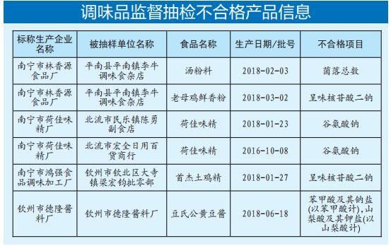 南寧新聞網(wǎng)—南寧晚報(bào)訊(記者 葉禎)近期,廣西食品藥品監(jiān)督管理局組織抽檢調(diào)味品、糖果制品、食用農(nóng)產(chǎn)品3類食品171批次樣品。抽樣檢驗(yàn)項(xiàng)目合格樣品161批次,不合格10批次。不合格批次產(chǎn)品包括味精、湯粉料、黃豆醬等調(diào)味品和上海青、油麥菜等蔬菜。