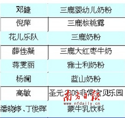 去年爆發的“三鹿奶粉事件”引起國人憤怒,該產品旗下鄧婕、花兒樂隊等多位代言明星遭到網友炮轟。網友們認為明星代言“事故產品”的事件屢次發生,他們不應該只知道拿代言費,更應該對此事件負責。
