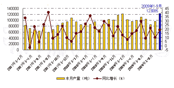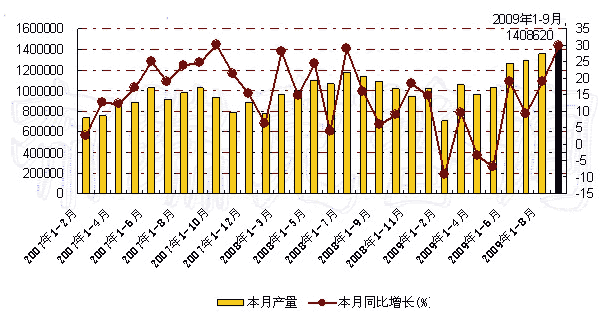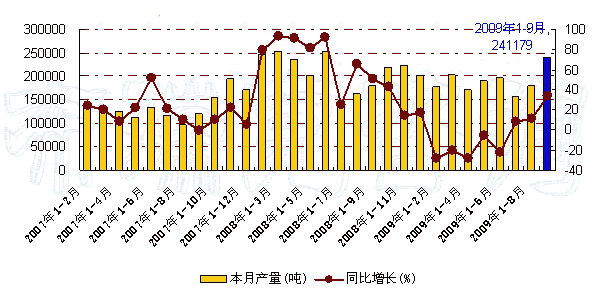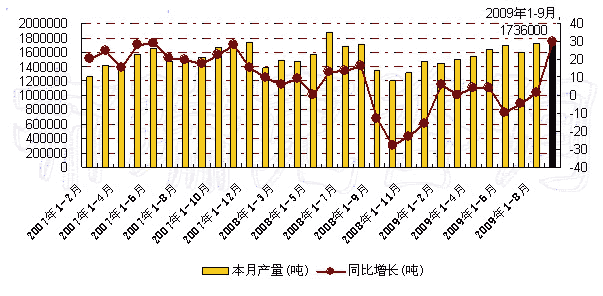 圖 2007年-2009年9月我國果汁及蔬菜汁飲料月度產量