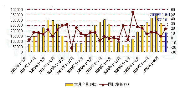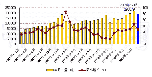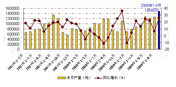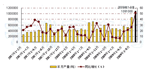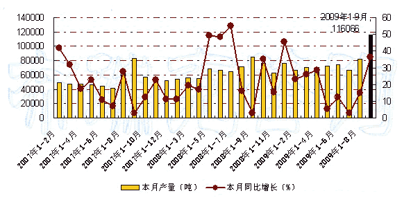 2009年9月我國共生產乳制品173.6萬噸,同比增速達到30%。去年9月恰逢三聚氰胺事件爆發,乳制品行業遭到巨大沖擊,從近幾個月乳制品的產量來看,自6月份國家推出食品安全法規以來,乳制品市場正得以逐步回復元氣,未來有望以更高速度增長。本榨季至9月底累計生產乳制品1687.7萬噸,累計同比增速為負的4.3%,降幅有所趨緩,經計算其用糖需求的貢獻比例為-0.5%。