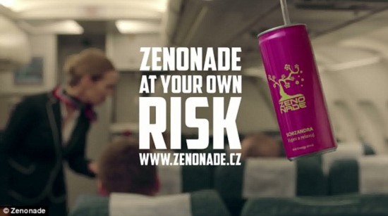 短片中,一位金發空姐正在向乘客做起飛前的安全示范,突然她對著鏡頭假笑,并說,“我將第一個下飛機,你們都會死”。接著,她掃視乘客說“死亡,死亡,死亡”,然后她指向自己說“存活”,隨后傳來對講機的聲音“祝您飛行愉快”。最后是廣告標語的聲音“喝Zenonade,風險自負”。You Tube網站解釋稱,這則廣告宣傳的Zenonade飲料是唯一一款上市的舒心飲品,不過,Zenonade的舒心效果還未經驗證,因此廣告傳達出自擔風險的理念。