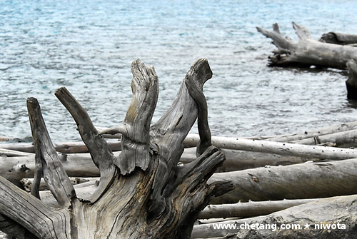 與路易斯湖隔山而鄰的,其實(shí)同樣精彩卻有點(diǎn)冷門的, 是小家碧玉般的夢蓮湖(Lake Moraine, 也有譯作莫蘭湖,都很夢幻, 都很古典而遙遠(yuǎn)。。。)。那天, 到的時(shí)候, 天有點(diǎn)陰沉。湖邊的風(fēng)更是大得有點(diǎn)意外,九月的“夏天”中竟然覺得有點(diǎn)冷, 不過,敢那是一種清新的刺激。 零落的古木, 冷清的小艇,在藍(lán)色的微驚的湖的波光里, 給我一種風(fēng)中的安靜。于是, 低回的腳步, 匆匆的走過湖邊的小徑; 目光仰首,看千萬年以來守護(hù)這一汪碧波的雪山十峰, 想像, 也許, 就可以這樣地馳騁在白雪云巔之上...