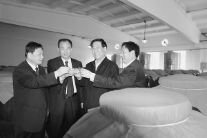 | 在金徽酒業集團儲酒庫,十一屆全國人大常委會委員、全國人大常委會內務司法委員會副主任委員張學忠(右二)和金徽酒業集團董事長、總經理周志剛(左二)、總經理助理田助中(左一)、副總經理胡彥華(右一)一起舉杯,品嘗存放30年的金徽陳酒。 |