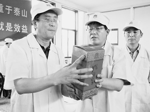 孔府家公司總經理李建國陪同省質監局質量處李應征(左)在孔府家酒包裝現場查看產品電子監管碼的貼標情況。  【特約記者/王健 通訊員/李艷華 攝影報道】