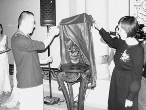 史玉柱與陳林為黃金酒產品揭幕。 本報訊 10月28日,五糧液集團與巨人投資公司共同推出的具有保健功效的黃金酒在北京人民大會堂亮相,這標志著兩個不同領域的巨人將大力進軍保健酒市