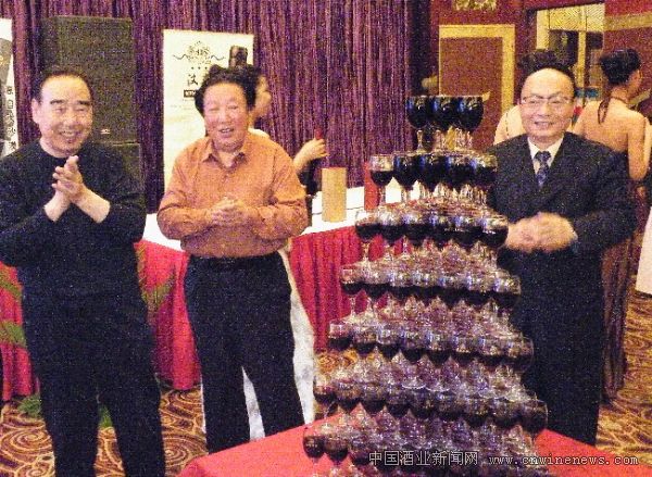 原內蒙古自治區人大副主任陳瑞清,著名詩人、詞作家、書法家火華,著名狂草書法家、原內蒙古自治區人大副主任賈才(從右至左),在新聞發布會現場為酒杯中注入醇美的漢森紅酒。