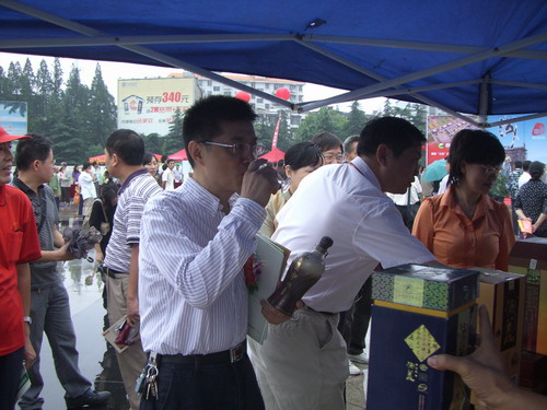 襄樊市商務(wù)局領(lǐng)導(dǎo)參觀公司展臺并品嘗“古隆中”黃金酒度(61.8度)酒