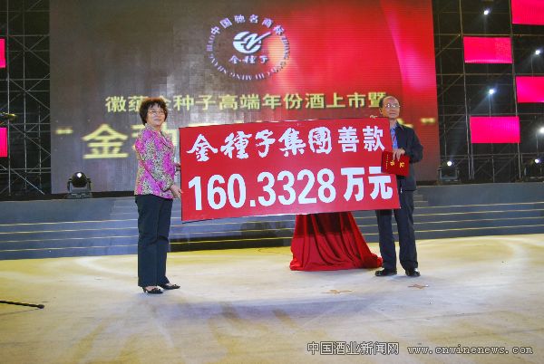 在合肥舉行的“徽蘊(yùn)金種子年份酒上市暨金種子情暖江淮”慈善捐贈晚會上,金種子集團(tuán)總經(jīng)理寧中偉代表企業(yè)將善款全部捐獻(xiàn)給安徽省慈善協(xié)會。