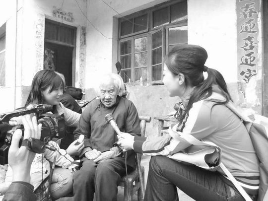 老人正在接受記者采訪 安富斌攝 11月2日,襄城區民政局、湖北古隆中演義酒業的工作人員帶著慰問品,專程來