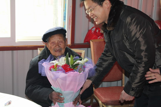 團拜會上,古隆中酒業公司銷售副總汪德強親自為百歲老人侯付元送上鮮花及演義金鉆酒,并祝福老人健康長壽。書法家向老人贈送書法作品。