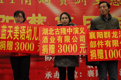 愛行襄陽,善行天下!湖北古隆中演義酒業有限公司勇擔社會責任,為此次團年宴捐贈了價值3000元的“演義”酒。當日,30余家愛心企業家捐贈愛心款和物資共計26.25萬元。