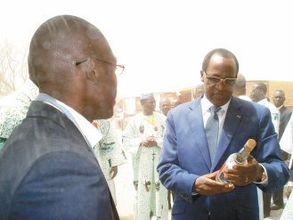 今年三月,布國總統龔保雷在布國農民日開幕典禮上,在高粱酒「SPIRIGHO」攤位前鑑賞把玩。 圖/我駐布吉納