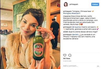 “青島啤酒,中國最好的啤酒,味道非常平衡,在甜和苦之間,更趨向于甜味的谷物味道,非常好喝!”在全球最大的在線圖片分享應用Instagram上,巴西姑娘Primayam分享出自己與青島啤酒的自拍,瞬間獲得近百個點贊。