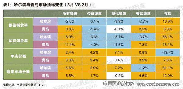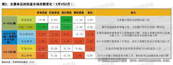 根據(jù)蘇賽特商業(yè)數(shù)據(jù)(SID)的月度追蹤數(shù)據(jù)顯示,3月份與2月份相比,哈爾濱啤酒的銷量份額上升了7個百分點,青島啤酒也上升了6個百分點;銷售額份額的變化情況是,哈爾濱啤酒上升了18個百分點,而青島啤酒上升了9個百分點。從絕對增幅來看,哈爾濱啤酒的優(yōu)勢更加明顯了,但是從相對增幅來看,哈爾濱啤酒的增長后勁略顯不足,畢竟哈爾濱啤酒的份額已經(jīng)處于很高的水平。