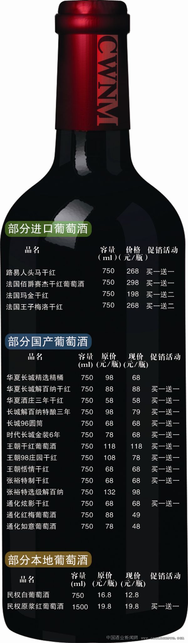 在進口葡萄酒旺銷的同時,國產知名葡萄酒銷售形勢也出現了井噴之勢,像張裕、長城、王朝等品牌葡萄酒,750ml裝的葡萄酒市場標價在100元/瓶左右,春節臨近,經銷商不斷加大促銷力度,大部分經銷商還制定了買一送一的優惠政策,實際售價在40元/瓶—50元/瓶。