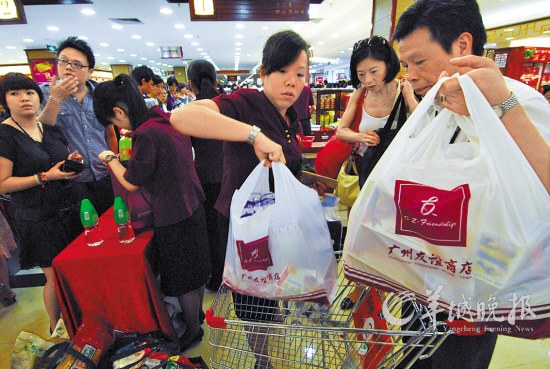 羊城晚報訊 記者孫晶、實習生鄒冰報道:25日的廣州商業異常熱鬧。在廣州友誼率先拋出史無前例的九日大促銷后,廣百、天河城百貨、摩登百貨也紛紛跟進,一場激烈的百貨折扣大戰在本周末強勢展開。記者巡城發現,精明的消費者已經學會選擇最劃算的商品出手,而高檔白酒等則相對受冷落。