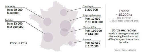 法國葡萄酒價高也反映了葡萄園土地價格情況。波爾多好地塊的價格最高可達260萬歐/公頃(大約113萬美元/英畝),勃艮第頂級地塊的價額甚至賣到1000萬/公頃(合約404萬美元/英畝)。香檳的地價相對低點,120萬歐/公頃($486,000/英畝);羅內谷(Rhône)414,000歐/公頃 ($167,500/英畝)。