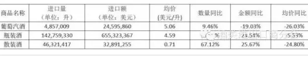 葡萄酒下屬的三個品類,瓶裝酒的進口量額增幅基本穩定,進口額增速有小幅提高;葡萄汽酒仍呈現量增額減的態勢,但進口量的增幅在下降,進口額的降幅進一步擴大,同時價格結構仍在調整;散裝酒的進口量額繼續回升。