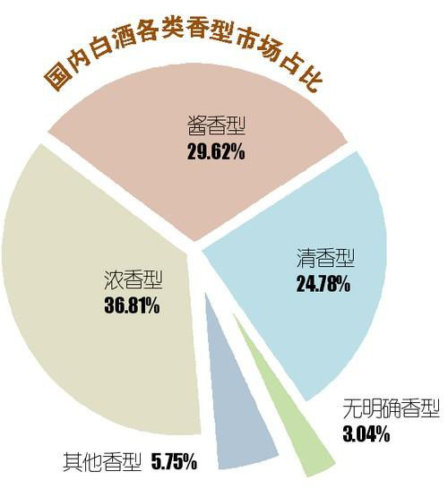那么哪種香型的酒賣得最好呢?銷售人員表示,中國名酒中,瀘州老窖特曲、劍南春、洋河大曲、古井貢酒、五糧液等都是濃香型白酒中的優秀代表;而醬香型又稱為茅香型,以貴州茅臺、四川郎酒為代表。中國酒業大數據平臺顯示,目前國內市場上,濃香型占比36.81%,醬香型占29.62%,清香型占24.78%,其他香型占5.75%,無明確香型占3.04%。