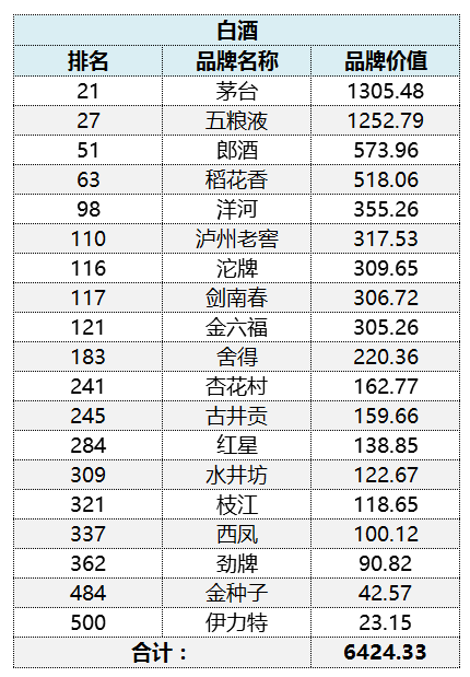 在這份食品飲料行業(yè)品牌分布名單中,茅臺以1305.48億位于行業(yè)榜首位置,總體排名為第21名。其他白酒方面,五糧液以1252.79億元位于該行業(yè)第三位(第二位為青島啤酒),總體排名為第27位。其他依次為:郎、稻花香、洋河、瀘州老窖、沱牌、劍南春、金六福、舍得、杏花村、古井貢、紅星、水井坊、枝江、西鳳、勁牌、金種子和伊力特。也就是說白酒行業(yè)有19個品牌入選。累計價值6424.33億元。(下圖單位均為:億元)