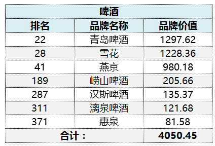 啤酒方面,此次入選品牌有青島啤酒、雪花、燕京、嶗山啤酒、漢斯啤酒、漓泉啤酒、惠泉7個品牌,累計品牌價值4050.45億元。
