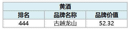黃酒方面,古越龍山以52.32億元的品牌價值入選,位列總排名的444名。