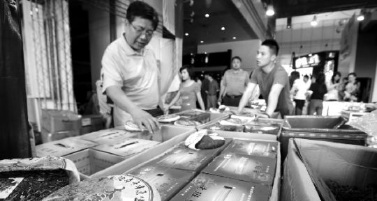 “近幾年,中秋節(jié)送茶禮之風(fēng)開始在武漢流行,送茶既低調(diào)又有品味,”崇仁路茶市場專做普洱茶的袁先生介紹,他們推出的茶禮主要是選自茶界“天才”何寶強(qiáng)先生制作的高端普洱茶,此茶不僅味道好還具有極高的收藏價值。此種普洱選用樹齡在60年以上的喬木料,經(jīng)過后期一系列最原始的加工,再進(jìn)入市場,考慮到市場接受程度,一般大眾消費(fèi)茶禮或是自飲類主要是以今大福的大品青餅為主推,零售指導(dǎo)價為350元/餅,玩家級的可以選擇班章“大白菜”系列,但價格偏高。