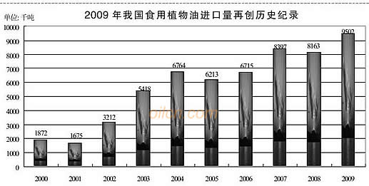 海關數據顯示,2009年我國進口44~56度棕櫚油硬脂132.7萬噸,較2008年增長109%;進口19~24度棕櫚油451.4萬噸,增長11.8%;進口初榨棕櫚油59萬噸,增長1%;進口其他棕櫚油及其分離品1萬噸,下降63%。