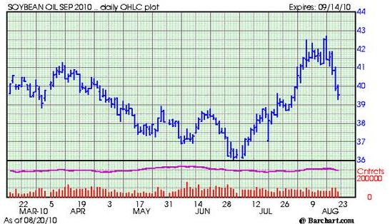 8月20日收盤時,9月豆油合約比一周前下跌了3美分,報收39.52美分/磅;10月合約下跌3.01美分,報收39.69美分/磅。