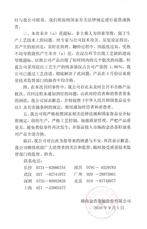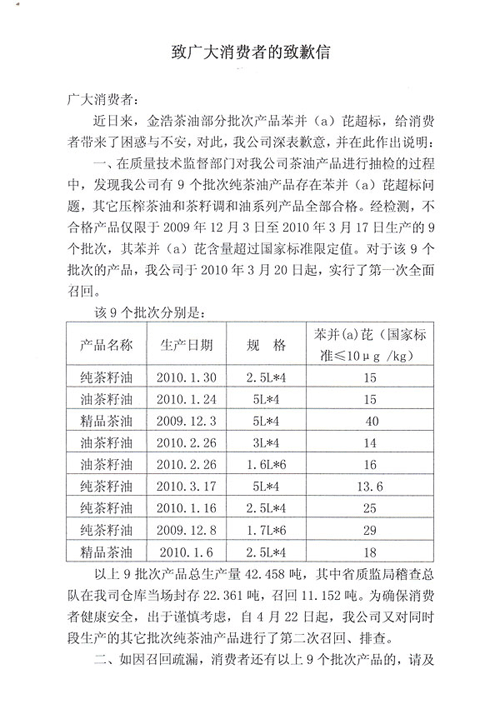 9月1日下午,湖南金浩茶油股份有限公司在其公司官方網(wǎng)站發(fā)表《致廣大消費(fèi)者致歉信》,承認(rèn)該公司9個批次純茶油產(chǎn)品存在苯并(a)芘超標(biāo)問題,并于2010年3月20日進(jìn)行過第一次全面召回。
