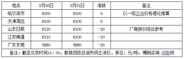 3月31日國內豆油現貨價格穩中窄幅偏弱調整