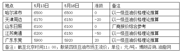 5月16日國內豆油現貨價格整體繼續偏弱調整,多數地區廠商報價隨盤下調20-150元/噸不等,個別地區工廠穩價