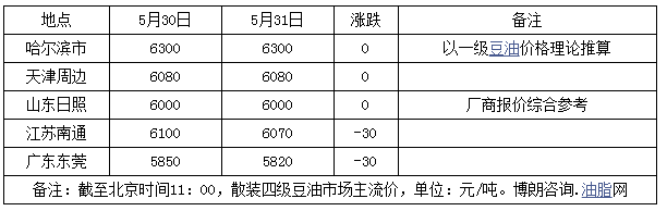 5月31日國(guó)內(nèi)豆油現(xiàn)貨價(jià)格整體持穩(wěn)運(yùn)行,僅少數(shù)地區(qū)廠商報(bào)價(jià)呈現(xiàn)20-50元/噸不等的漲跌調(diào)整,美盤此前休市無(wú)