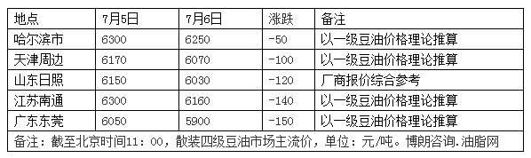 7月6日國內豆油現貨價格整體下移,多數地區廠商報價隨盤下調100-150元/噸不等,少數地區工廠停報觀望。