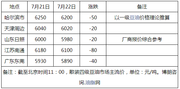 7月22日全國部分地區(qū)散裝四級豆油銷售價(jià)格