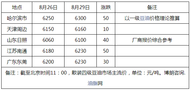 博朗咨詢跟蹤統計,國內散裝一級豆油均價為6295元/噸,較上周五均價上漲36元/噸;散裝四級豆油均價為6180元/噸,較上周五均價上漲32元/噸;進口毛豆油均價為6121元/噸,較上周五均價上漲33元/噸。