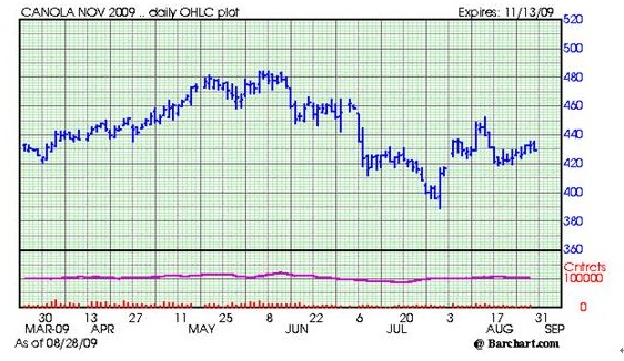8月28日收盤時,11月油菜籽合約比一周前漲了5.90加元,報收429.60加元/噸;1月合約漲了5.80加元,報收433.60加元/噸。