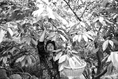 日前,四川汶川雙河村羌族婦女依娜在標準化大櫻桃田里告訴筆者,汶川災后農業加快重建步伐,具有標準化品牌的“汶川甜櫻桃”每斤單價為35元,倍受中外游客的青睞,她在田間地頭就賣完了大櫻桃。圖為依娜在田頭采摘標準化大櫻桃。 董 勇 攝