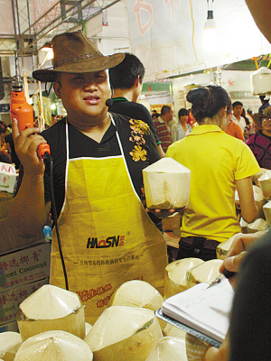 昨天,記者來到了農博園的2號展廳,在一家賣椰子的展臺前,看到來買椰子的人還不少。“我們的椰子都是從海南空運過來的,銷量很好,平時一天能賣1000多個,趕上周末能賣到2000多個。”展商邵海龍介紹,他們是第三次參加農博會,由于趕上天氣炎熱,椰子又有降溫解暑的功效,所以每年賣得都很好。
