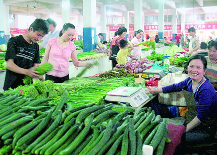 6月8日,西安建國路蔬菜市場,市民正在選購蔬菜。隨著夏季蔬菜生產旺季的到來,西安蔬菜價格逐漸回落,市場上“一元錢”以下的蔬菜又重新回歸市場。在胡家廟、朱雀蔬菜批發市場,豆角、西葫蘆、黃瓜、蓮花白等20多個品種的蔬菜較上月初平均價格下降了30%,市民的“菜籃子”花費也悄然減輕了。