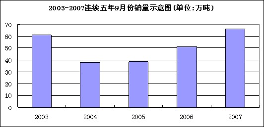 在供給量已經(jīng)確定的前提下,銷售量是決定商品價格走向的關(guān)鍵性因素,然而對最近五年來的食糖銷售情況進行統(tǒng)計,卻讓我們對今年的情況感到擔(dān)憂。下圖展示的是2003年至2007年連續(xù)五年各年份九月份的食糖銷售數(shù)據(jù),圖表顯示,五年的時間里,九月份的銷售峰值為2007年的66萬噸,低谷為2004、2005年的38萬噸,平均值為51萬噸。對比五年數(shù)據(jù)來看一看本榨季截止八月末時的工業(yè)庫存(230.73萬噸),不寒而栗的感覺便油然而生。