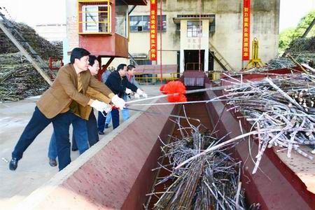 11月29日,金風(fēng)送爽,艷陽(yáng)高照,在歡快的禮炮聲中,隆安南華公司南圩糖廠2008/2009年甘蔗榨季正式拉開(kāi)帷幕,這標(biāo)志著隆安縣2008/2009年甘蔗榨季正式啟動(dòng)。韋才團(tuán)、隆成碧、廖偉福、甘強(qiáng)忠、唐小若等縣領(lǐng)導(dǎo)和南寧市經(jīng)委、市糖辦有關(guān)領(lǐng)導(dǎo)到場(chǎng)祝賀,并鼓勵(lì)該公司拓展經(jīng)營(yíng),為隆安經(jīng)濟(jì)發(fā)展多作貢獻(xiàn),實(shí)現(xiàn)雙贏。儀式上,市、縣領(lǐng)導(dǎo)共同將第一批待榨甘蔗勾下傳送槽。瞬間,壓榨車(chē)間機(jī)器轟鳴,傳送帶把原料蔗源源不斷地輸入壓榨車(chē)間。隨后,參加儀式的領(lǐng)導(dǎo)還一同參觀了該糖廠生產(chǎn)車(chē)間。