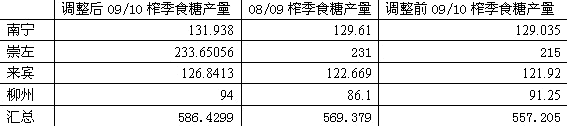 綜上所述,我們通過對不合理的數(shù)據(jù)或者是相互矛盾的數(shù)據(jù)進(jìn)行篩選剔出,根據(jù)上一榨季的單產(chǎn)情況及考察過程中收集到的信息得出調(diào)整甘蔗單產(chǎn)前后的廣西四大產(chǎn)區(qū)2009/2010榨季的食糖產(chǎn)量預(yù)估。通過對于單產(chǎn)進(jìn)行適度的調(diào)整,我們得出2009/2010榨季廣西四大產(chǎn)區(qū)的食糖總產(chǎn)量預(yù)估為586.43萬噸,較2008/2009榨季食糖產(chǎn)量增加17.05萬噸,而較單產(chǎn)調(diào)整前食糖產(chǎn)量增加29.22萬噸。