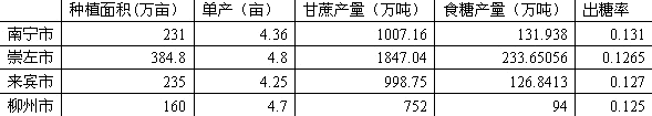 來賓單產(chǎn)調(diào)整依據(jù):興賓區(qū)是來賓市的主要產(chǎn)糖區(qū),占來賓市種植面積的61%,興賓糖辦的李主任認(rèn)為2009/2010榨季的單產(chǎn)要較2008/2009榨季提高0.3噸。上一榨季的產(chǎn)糖率為12.47%,本榨季可能提高0.3%。因此,結(jié)合上一榨季的單產(chǎn)水平及興賓區(qū)的單產(chǎn)水平,我們調(diào)整來賓市的單產(chǎn)水平為4.25噸/畝,得出其2009/2010榨季的食糖產(chǎn)量預(yù)測為126.84萬噸,較上一榨季增加4萬噸。