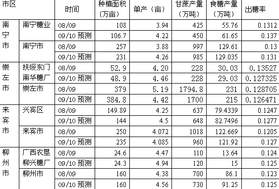 通過為期4天的考察,我們得到了廣西四大產(chǎn)區(qū)及這些地區(qū)所轄部分糖廠和蔗區(qū)甘蔗種植面積、單產(chǎn)、甘蔗產(chǎn)量、食糖產(chǎn)量及出糖率的相關(guān)數(shù)據(jù),為了保持?jǐn)?shù)據(jù)的一致性及數(shù)據(jù)的篩選與剔出,筆者主要根據(jù)種植面積、甘蔗產(chǎn)量及出糖率來計(jì)算出單產(chǎn)及食糖產(chǎn)量。公式如下:單產(chǎn)=甘蔗產(chǎn)量/甘蔗種植面積、食糖產(chǎn)量=甘蔗產(chǎn)量×出糖率。然后,根據(jù)我們調(diào)研中了解的單產(chǎn)情況以及對比2008/2009榨季的情況,再對食糖產(chǎn)量進(jìn)行調(diào)整,最終得到廣西四大產(chǎn)區(qū)的食糖產(chǎn)量預(yù)估。公式如下:食糖產(chǎn)量=種植面積×單產(chǎn)×出糖率。