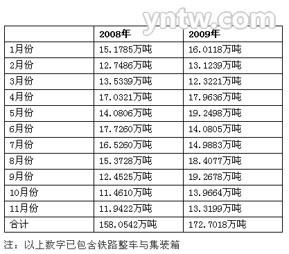 附:云南省2008、2009年1-11月份食糖鐵路外運(yùn)量對(duì)比如下: