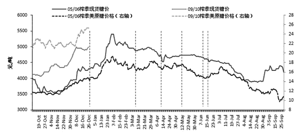 2009/2010榨季初期,在鄭州召開的糖會預測產量為1200萬噸,消費量為1450萬噸,產消缺口預期高達250萬噸,而國家食糖儲備總量在300萬噸左右,盈余僅有50萬噸。與2005/2006榨季相比,本榨季之初預期的缺口更大,但國儲糖盈余相對較低,因而市場供需狀況從價格方向上的反應較2005/2006榨季更早。
