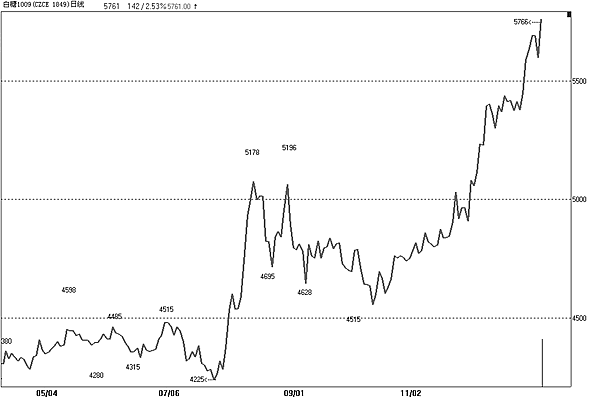 2009年最后一個交易日鄭糖再現(xiàn)普漲,主力合約SR009以2.53%的漲幅長陽收官,當(dāng)日期價創(chuàng)出5766元/噸的年內(nèi)新高。回顧一年的走勢,鄭糖呈現(xiàn)觸底反彈、持續(xù)上漲的特點。