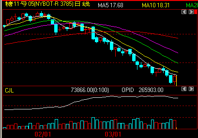 ICE原糖期貨周三(24日)從10月低位反彈,收盤大幅上漲,市場進行修正,5月原糖期貨收盤上漲110點,或6.2%,報收17.67美分/磅。該合約盤中一度觸及16.17美分/磅,是2009年5月以來的最低點。