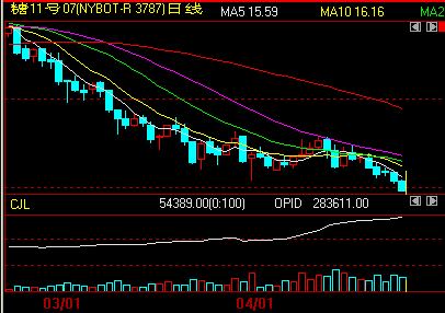 5月原糖期貨收盤下跌0.49美分,或3%,報14.63美分/磅,是自2009年5月1日以來的最低點。7月原糖期貨合約收盤下跌0.51美分,或3%,報14.68美分/磅,盤中觸及14.81美分低位。